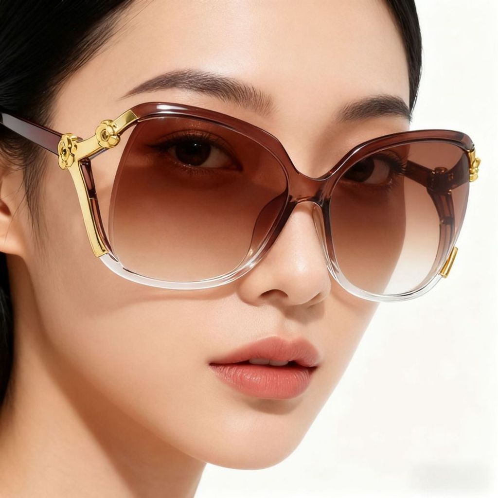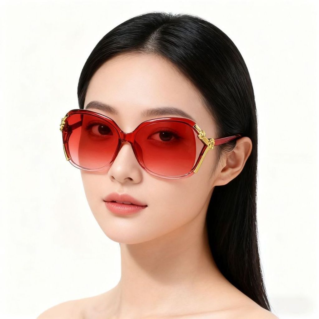 This is a pair of fashion oversized square sunglasses with gradient orange-red lenses and gold-toned metal details on the sides