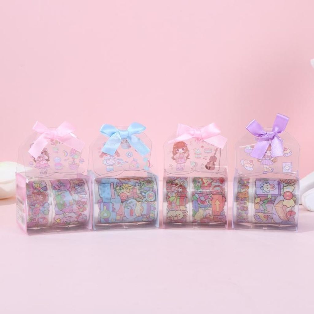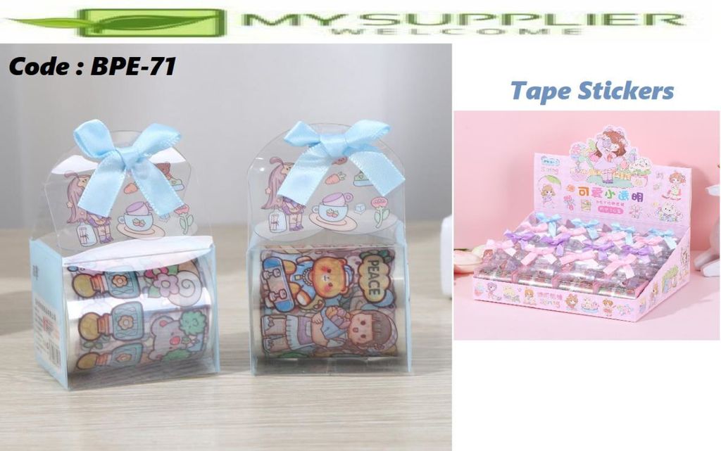 Tape Stickers: These are usually rolls or sheets of decorative tape with cute cartoon designs. They might be washi tape or similar materials that are easy to tear and apply. They often come in various patterns and colors featuring cartoon characters or fun graphics.