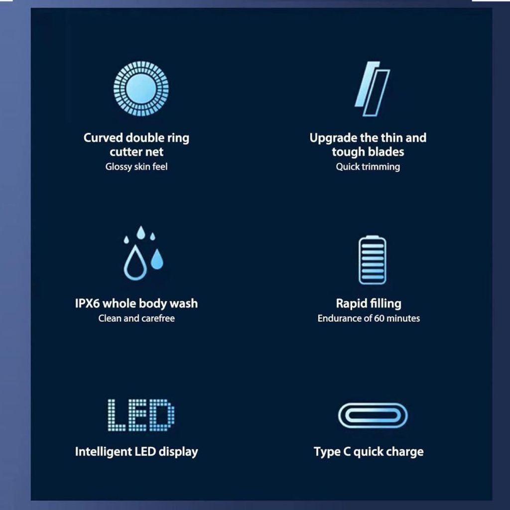 - Suitable face curve: floating head, 360 degrees, no dead angle cutting, adapts to different face shapes, fast trimming, is fully waterproof and can be washed under running water for easy cleaning.