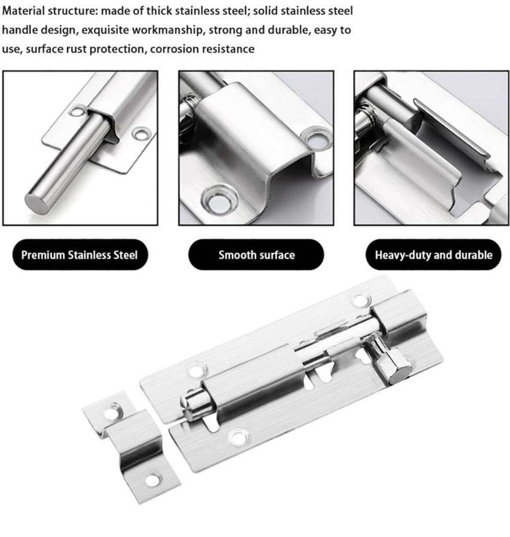 - Type: Can be sliding, barrel, or tower bolt.