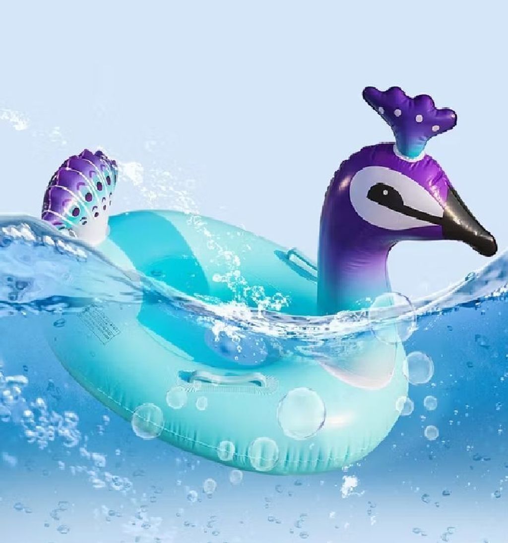 The item is an IRIS Peacock Baby Pool Float.