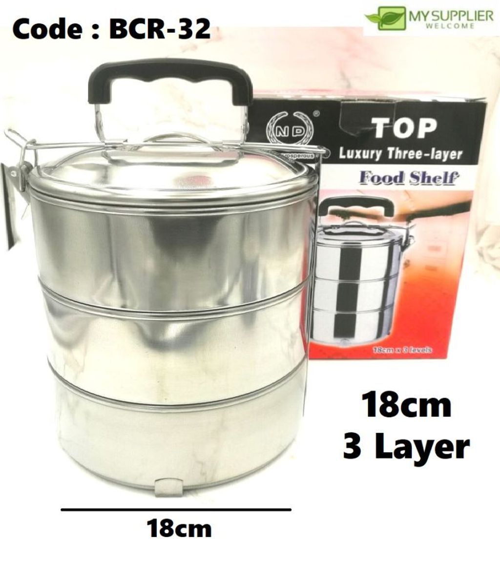 BCR-32 Top Luxury (18cm) 3 LAYER Stainless Steel Food Shelf Tiffin Carrier Lunch Box D18*H27cm