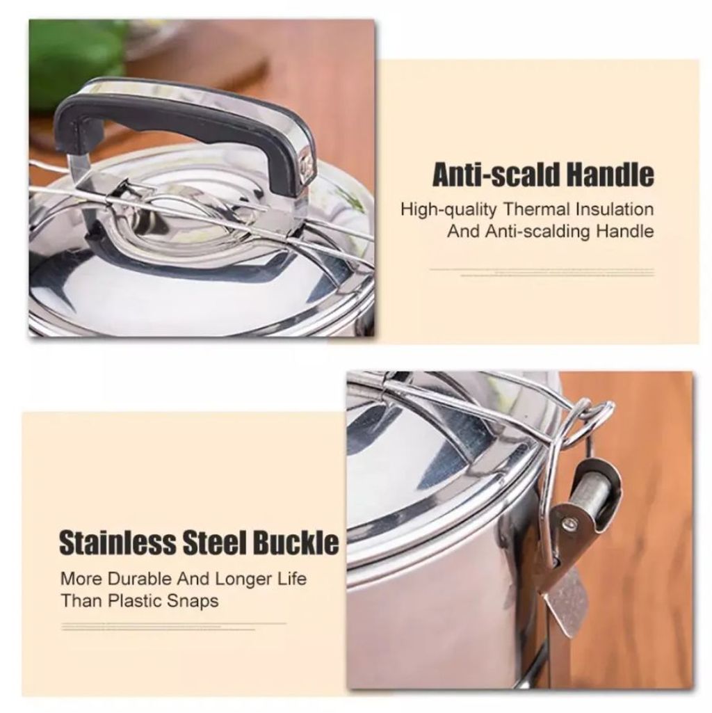 design. Simply fill each container with fruits, salad, sandwiches, noodles, rice, veggies and snacks, stack the containers on top of each other and close the clasp. The rounded food containers are perfect for household uses, work places, commuters, picnic and camping. In addition, the stainless steel body bears a better life-time compare to that of plastic.