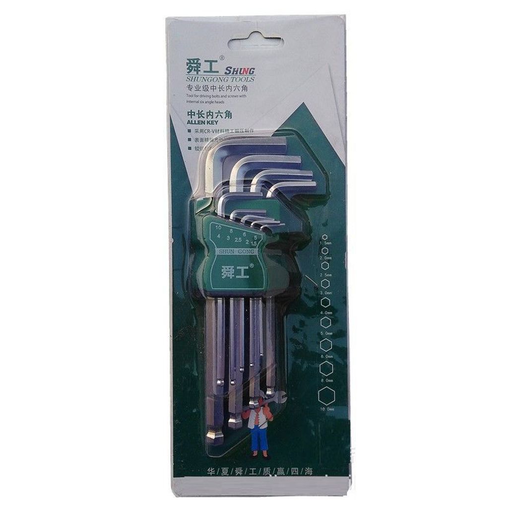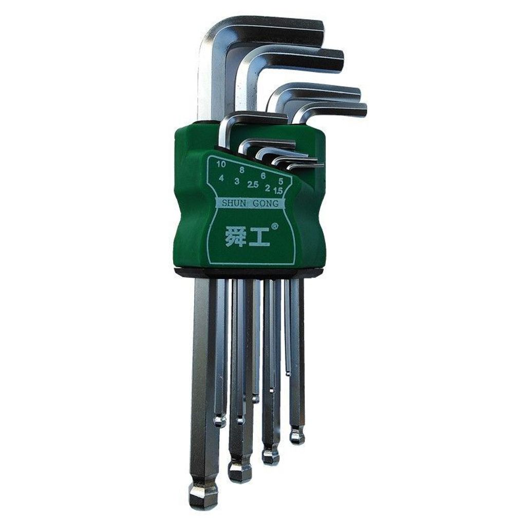• The tool typically offers 9 different sizes of internal hex heads, making it versatile for various bolt sizes. The compact design allows for easy storage and portability.