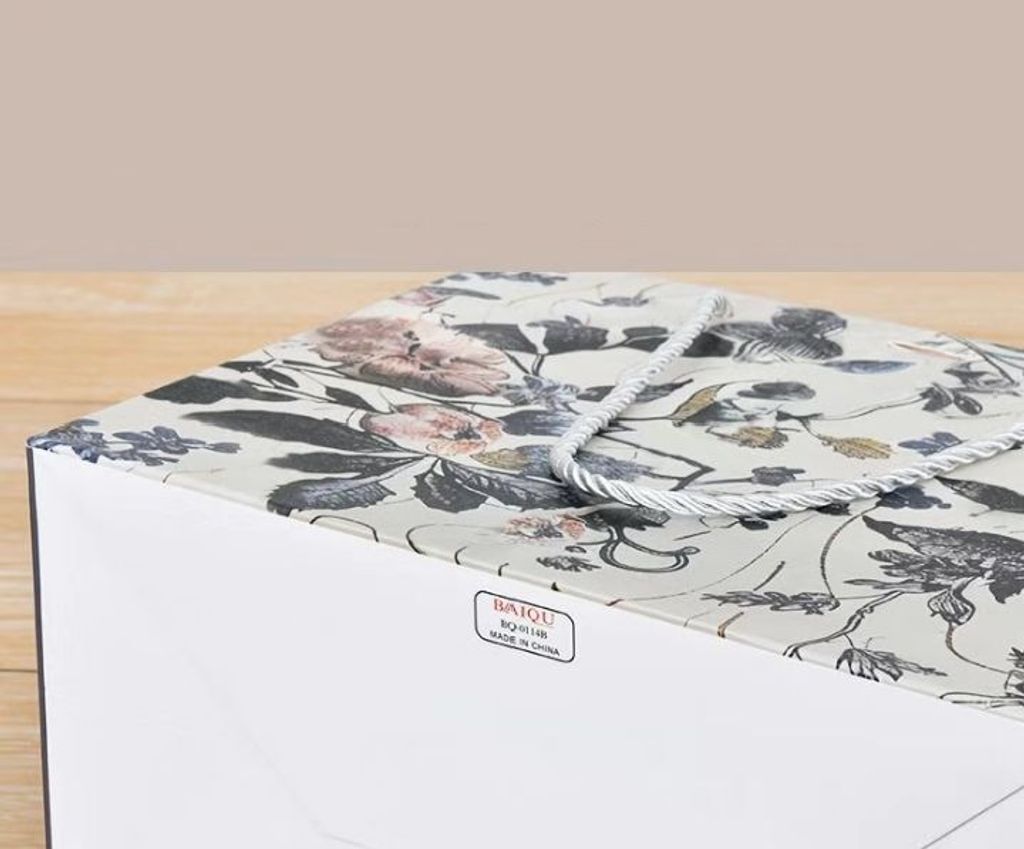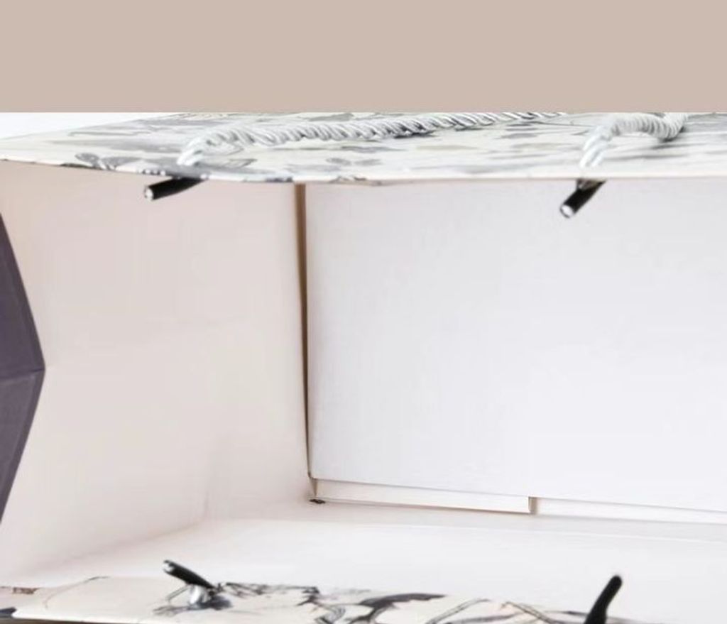 Material: Typically made of sturdy paper or fabric with a decorative finish (e.g., kraft paper, laminated, or textured).